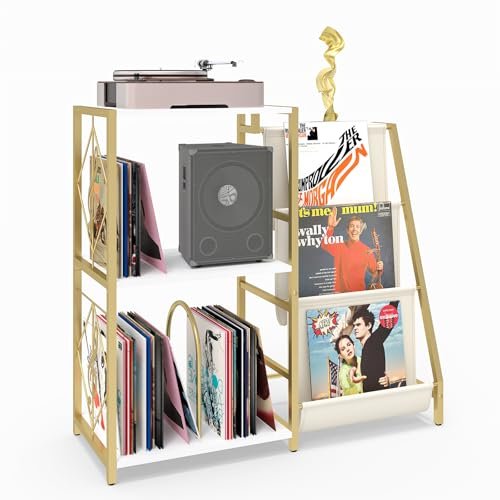 INHABIT UNION Suporte para toca-discos com armazenamento de discos de vinil, suporte de toca-discos com armazenamento de discos de vinil de 3 camadas, prateleira para sala de estar e quarto, dourado (Equipamentos)