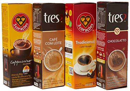 Kit de Cápsulas 3 Corações 40 Cápsulas – Chocolate Quente, Cappuccino Classic, Café com Leite, Filtrado – Torra Escura, Sem Açúcar (Café)