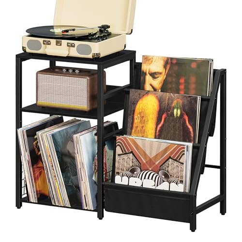LELELINKY Mesa Final Preta, Suporte para Toca-Discos com Armazenamento de Vinil, Mesa Lateral de 3 Camadas com Prateleira de Exibição para Armazenamento de Até 150 Álbuns, Armário Industrial Grande Pa (Equipamentos)