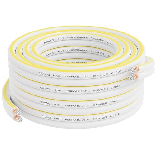 Mygatti Fio de alto-falante de 1,5 m, fio de alto-falante de áudio calibre 16/2, para alto-falantes estéreo, home theater, fio automotivo, jaqueta branca com marcador de polaridade amarelo, 16AWG CCA (Equipamentos)