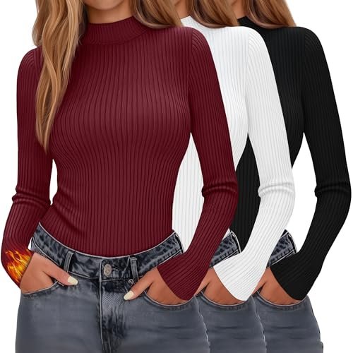 Evervibe Pacote com 3 camisetas femininas de algodão com gola redonda, manga comprida, gola rolê, térmica, justa, casual, camada de base, Preto, branco, vinho, XGG (Vinhos)
