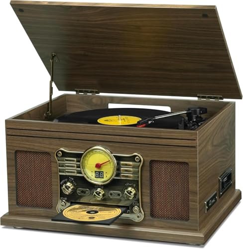 VEDO Toca-discos Bluetooth 10 em 1, toca-discos de vinil de 3 velocidades com alto-falantes, conversor de LP para MP3, CD, toca-fitas, rádio FM, streaming sem fio (cor de grão de madeira escura) (Discos de Vinil)