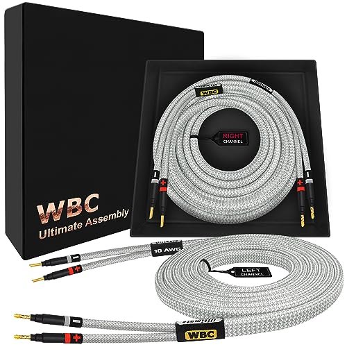 WORLDS BEST CABLES 8 pés Ultimate – 10 AWG – Ultra-Pure OFC – Cabo de alto-falante audiófilo HiFi Premium, par com plugues banana dourado Eminence e jaqueta de tweed prata (Equipamentos)