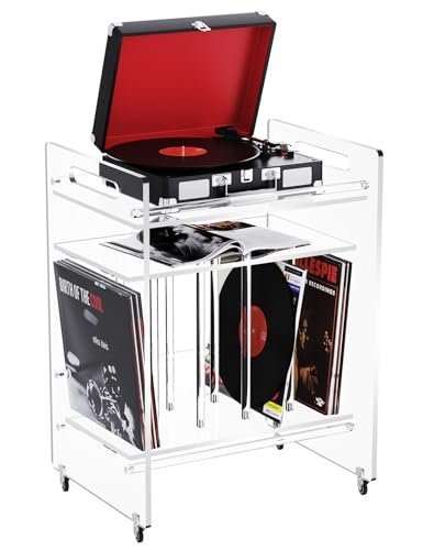 Suporte para toca-discos de acrílico com prateleira de armazenamento, suporte para toca-discos de vinil transparente, mesa lateral de 3 camadas com rodas (grande transparente) (Equipamentos)