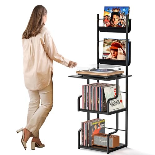 TJ.MOREE Suporte para toca-discos com armazenamento de vinil, mesa alta para toca-discos com suporte para toca-discos e suporte para discos, prateleira de exibição de vinil de até 210 álbuns (Equipamentos)