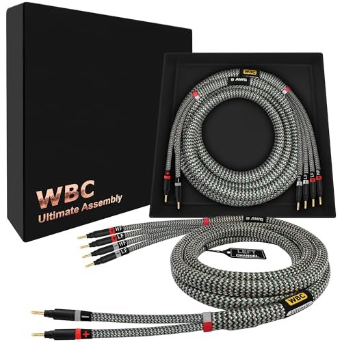 WORLDS BEST CABLES 8 pés Ultimate – 9 AWG – Ultra-Pure OFC – Cabo de alto-falante audiófilo HiFi Bi-Wire Premium par com plugues banana dourado Eminence e jaqueta de tweed StlGrn (Equipamentos)