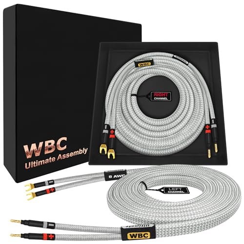 WORLDS BEST CABLES Cabo de alto-falante audiófilo HiFi premium de 15 pés – 8 AWG – OFC ultra puro – par com plugues Eminence Gold Banana (x2) e Spade (x2) e jaqueta de tweed prata (Equipamentos)